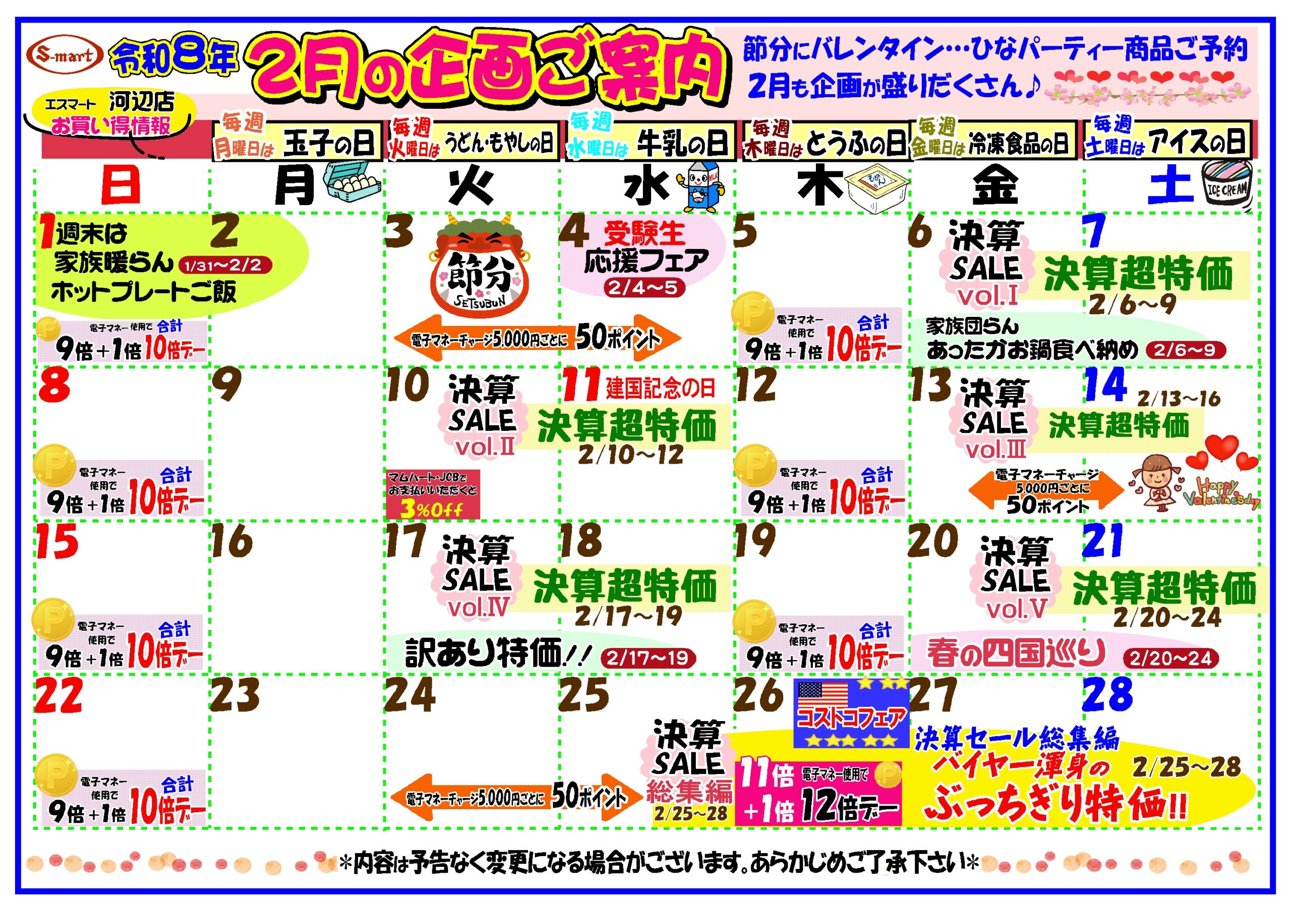 2月の月の企画イベントカレンダー 河辺店用