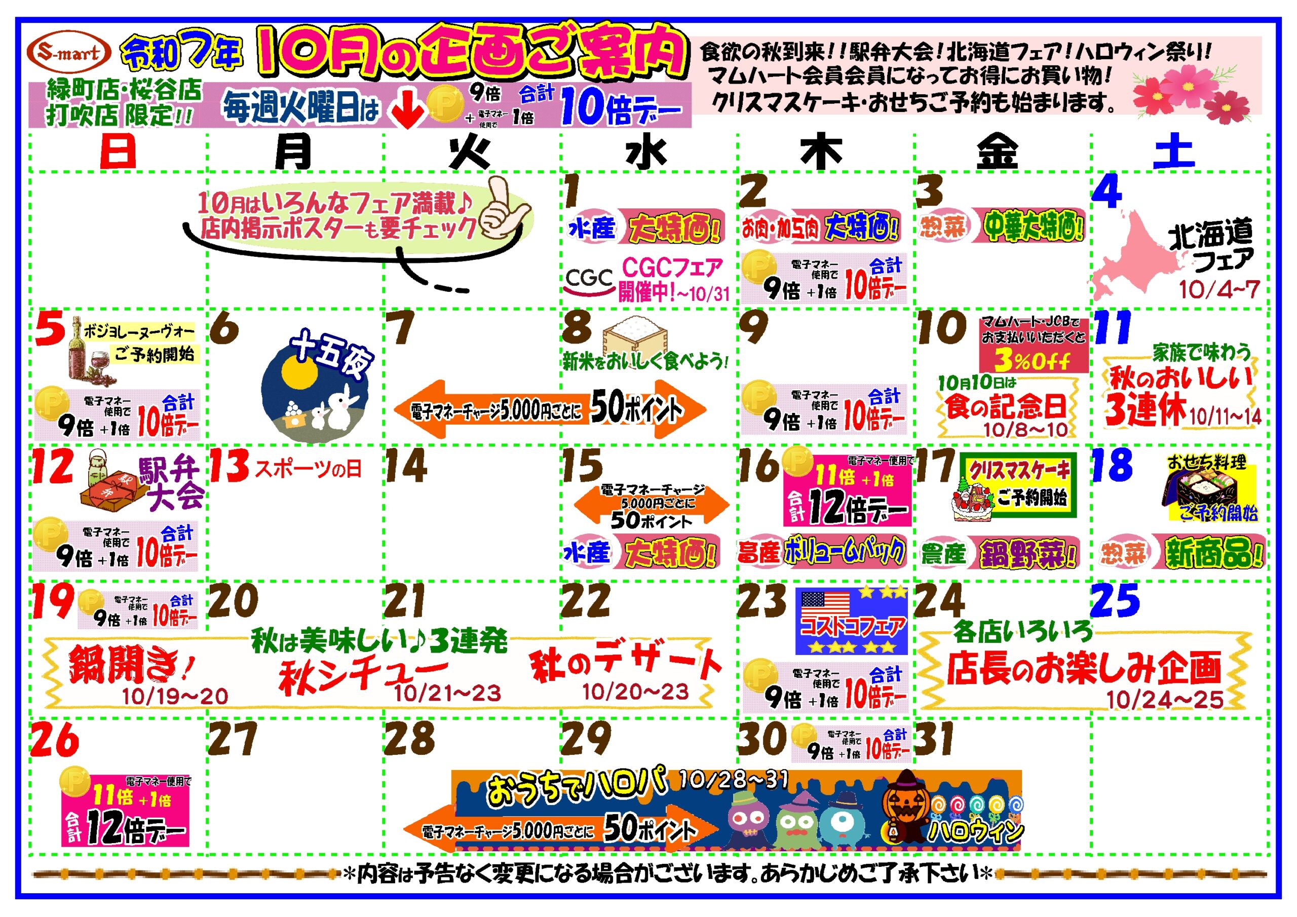 10月の企画イベントカレンダー 打吹店・緑町店・桜谷店