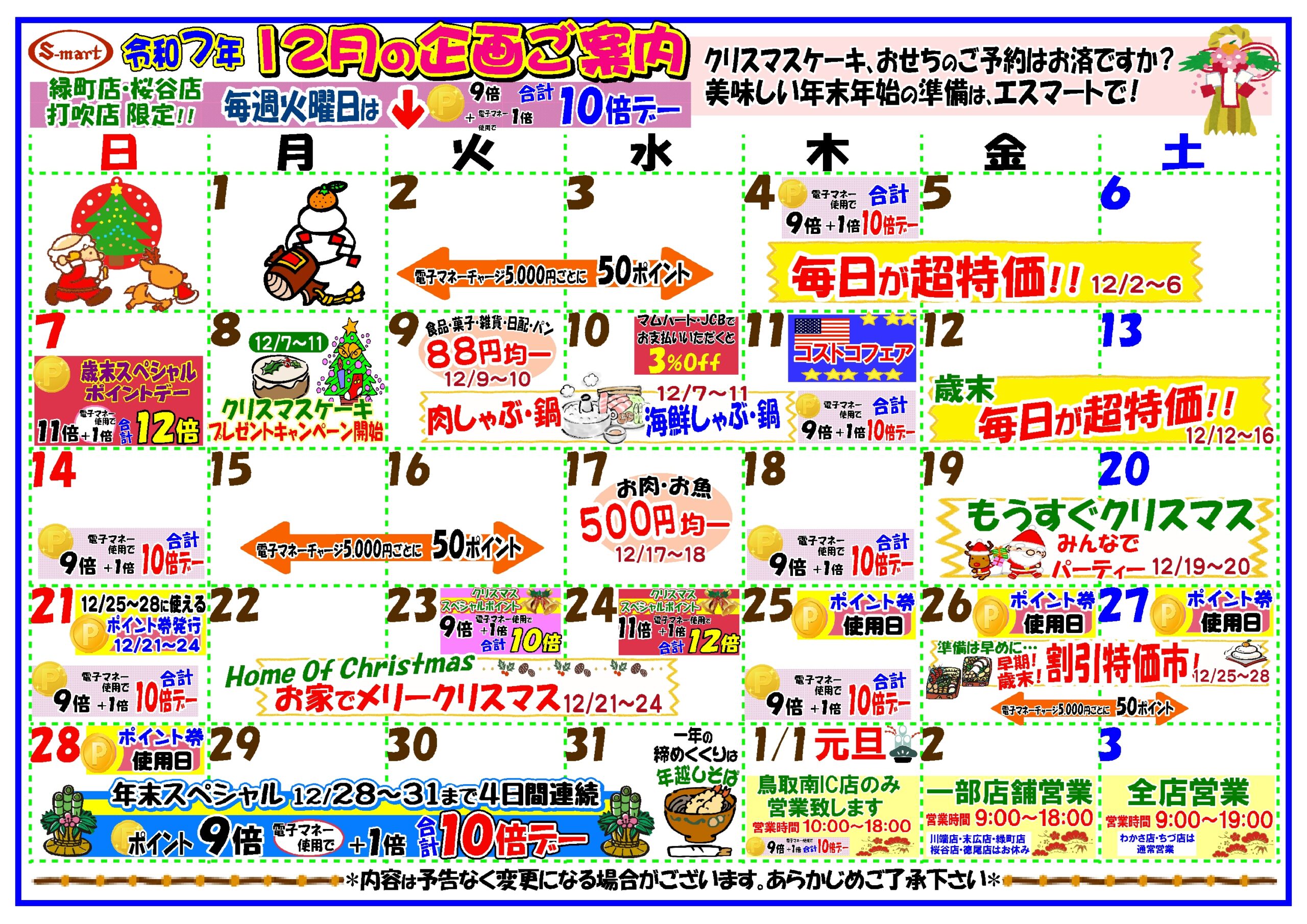 12月の企画イベントカレンダー 打吹店・緑町店・桜谷店