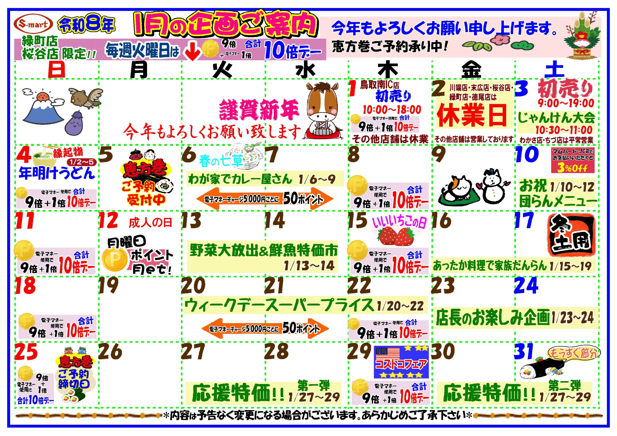 1月の企画イベントカレンダー 緑町店・桜谷店
